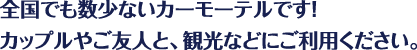 沖縄でも数少ないカーモーテルです。沖縄市のラブホテルをお探しでしたら、フロントを通さずにお部屋にダイレクトに入室でき、プライベートも安心な当ホテルをご使用ください。沖縄市、嘉手納町、読谷、うるま市、北谷町など中部近辺のホテルをお探しならホテル甲子園・甲子園Jrをご利用ください。